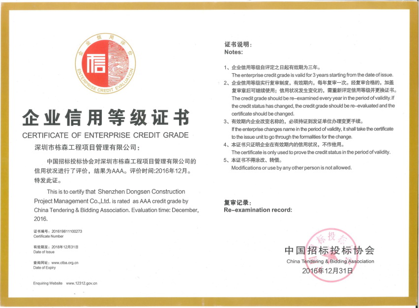 深圳市棟森工程項目管理有限公司本著"實在做事、厚道做人、感恩社會"的經營理念,力求通過誠信為基石,保持公司健康的可持續性發展。